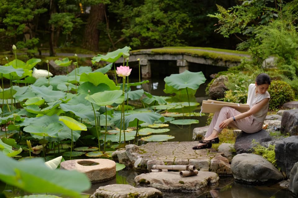 関雪先生が理想郷として〝描いた〟蓮の庭は実際、まるで、この世でないかのような美しさで、陽射しの中で自分も描きながら全身で見つめていると、重たい重力や意識と共に自分の中のあらゆるつまらない境界線がとろとろ溶けていくようです