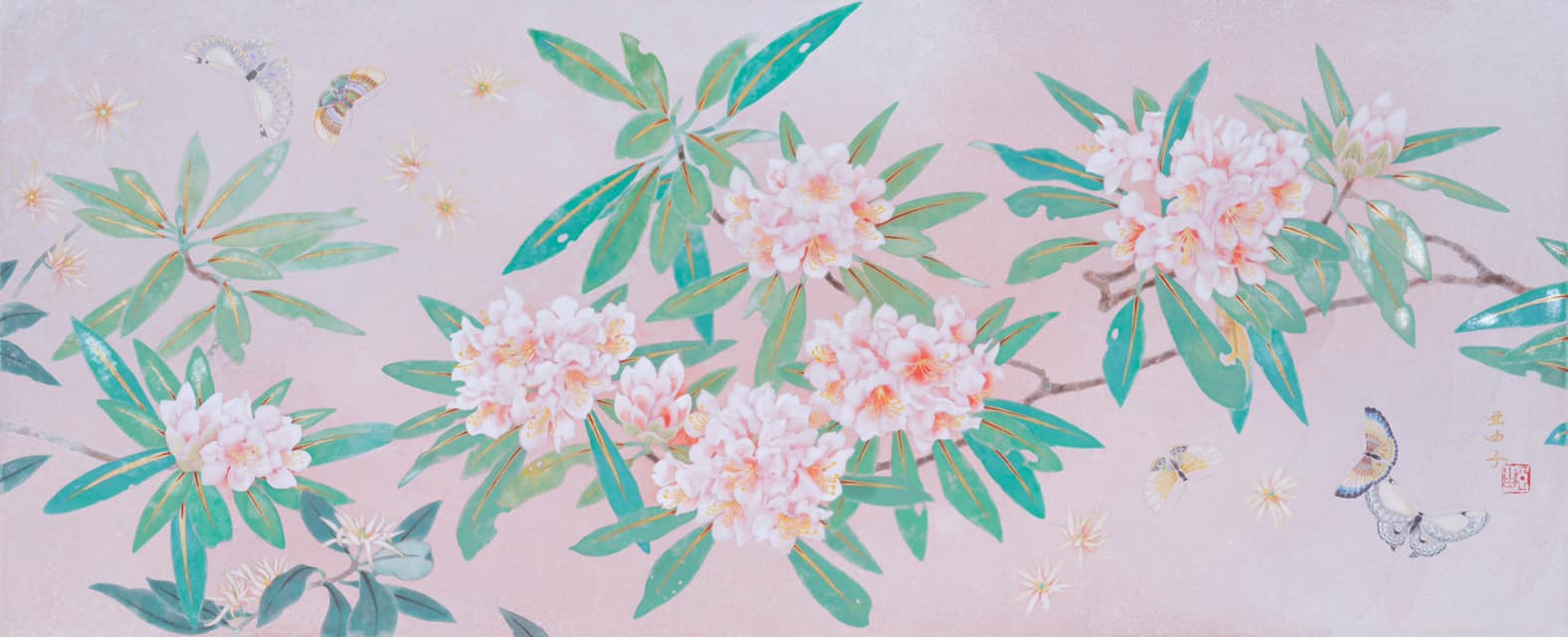 5月、高野山の女の子と惠光院さまの裏庭で写生させていただいた石南花、そして、シキビの花。