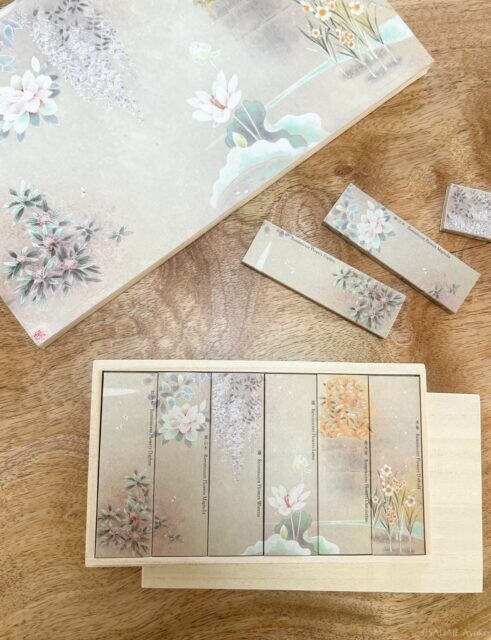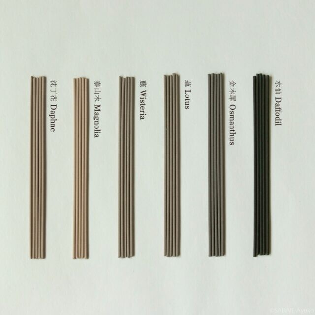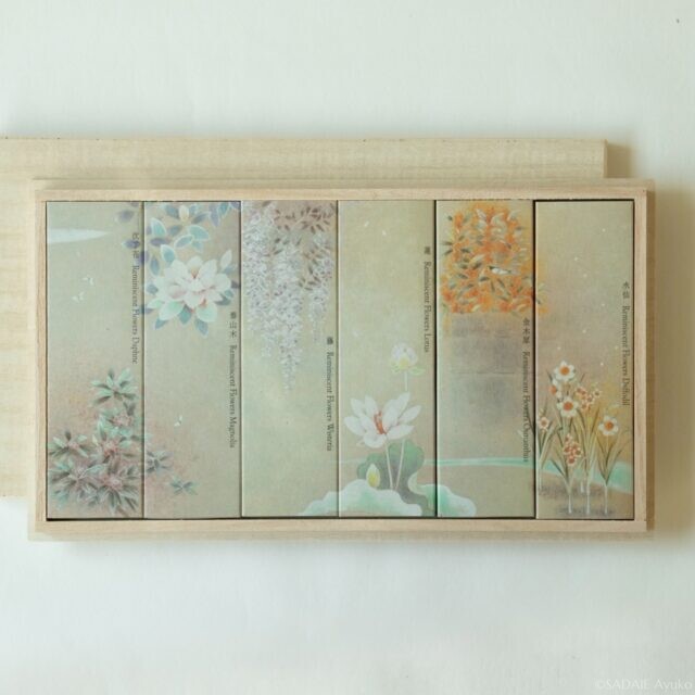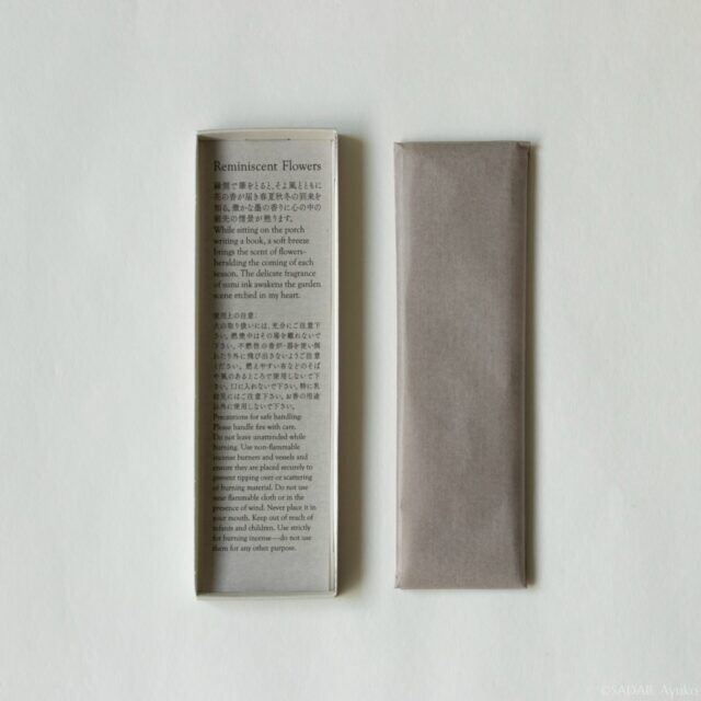 墨の香を織りまぜ繊細に表現されたお香は、春の沈丁花、初夏の泰山木と藤、盛夏の蓮、秋の金木犀に冬の水仙。