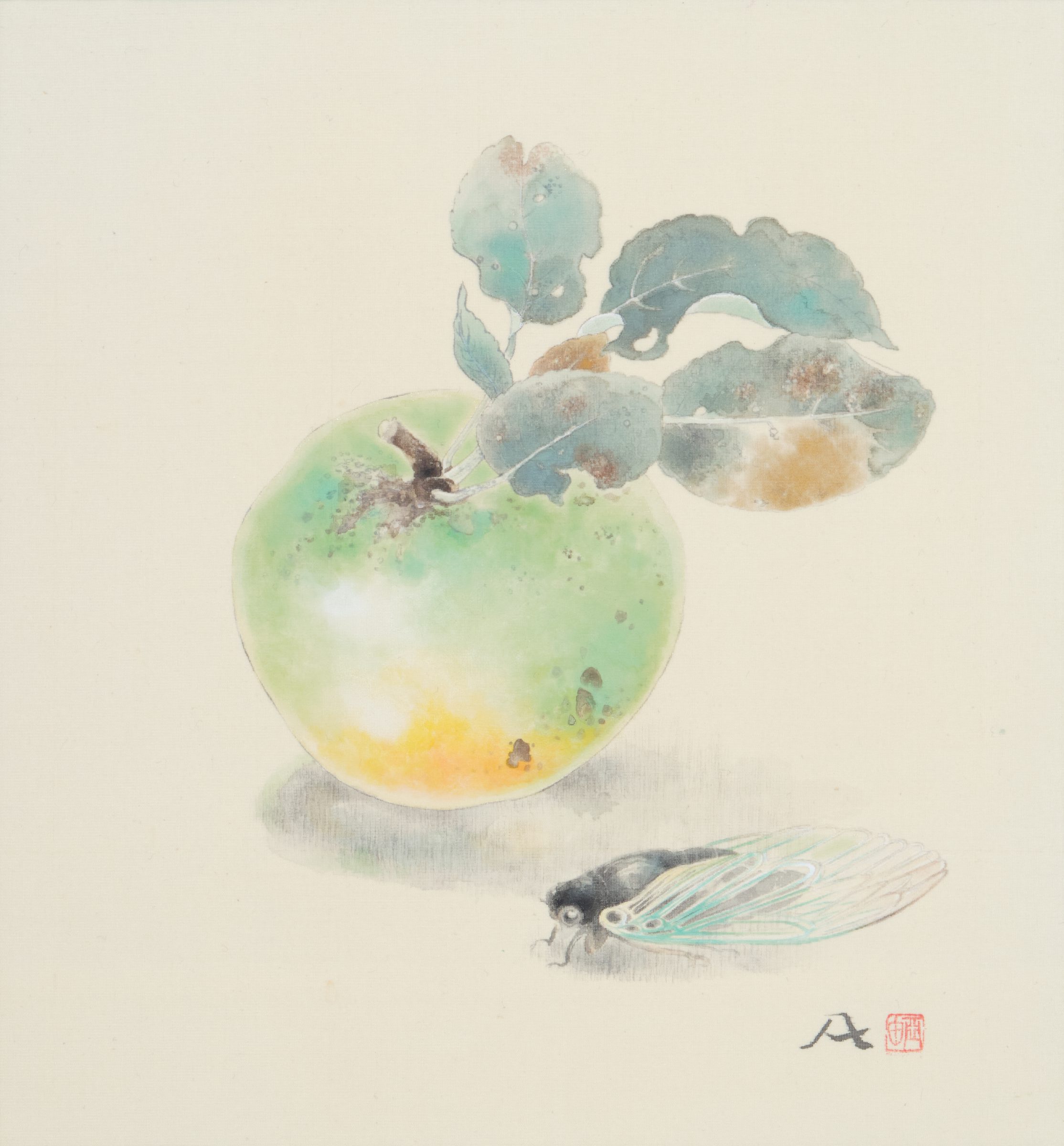 夏林檎とクマゼミ / 掛け軸 / 絹 墨 岩絵具/ 2021