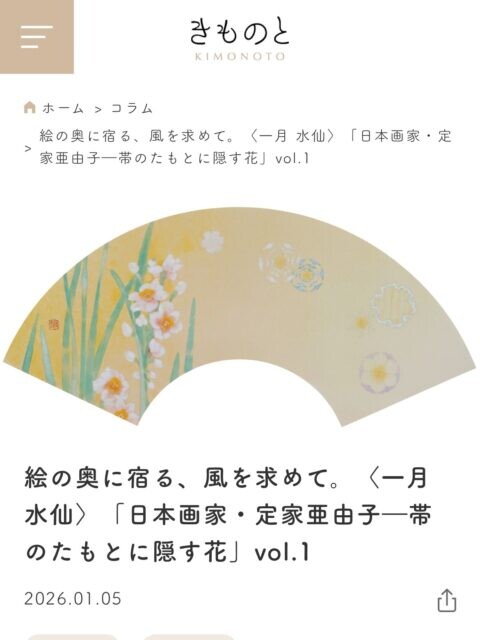 きものと「定家亜由子―帯のたもとに隠す花」vol.11 エッセイ連載スタート 2026-01-07本年も何卒よろしくお願い申し上げます。「日本画家・定家亜由子―帯のたもとに隠す花」vol.12026年は、オンラインでご覧いただけます「きものと」さんのコラム(エッセイ)にて、連載をいたしますhttps://www.kimonoichiba.com/media/column/1661/私が描いたものの中から、お気に入りの扇面画も添えました。今回は宮脇賣扇庵さんの扇子に原画を描きました、「水仙と雪輪」を。その風のつぼみのおはなしです毎月5日に掲載是非ご覧ください